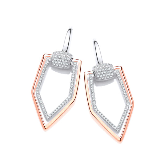 Elegant sterling silver fancy drop earrings with a rose-coated finish, featuring a striking geometric design...