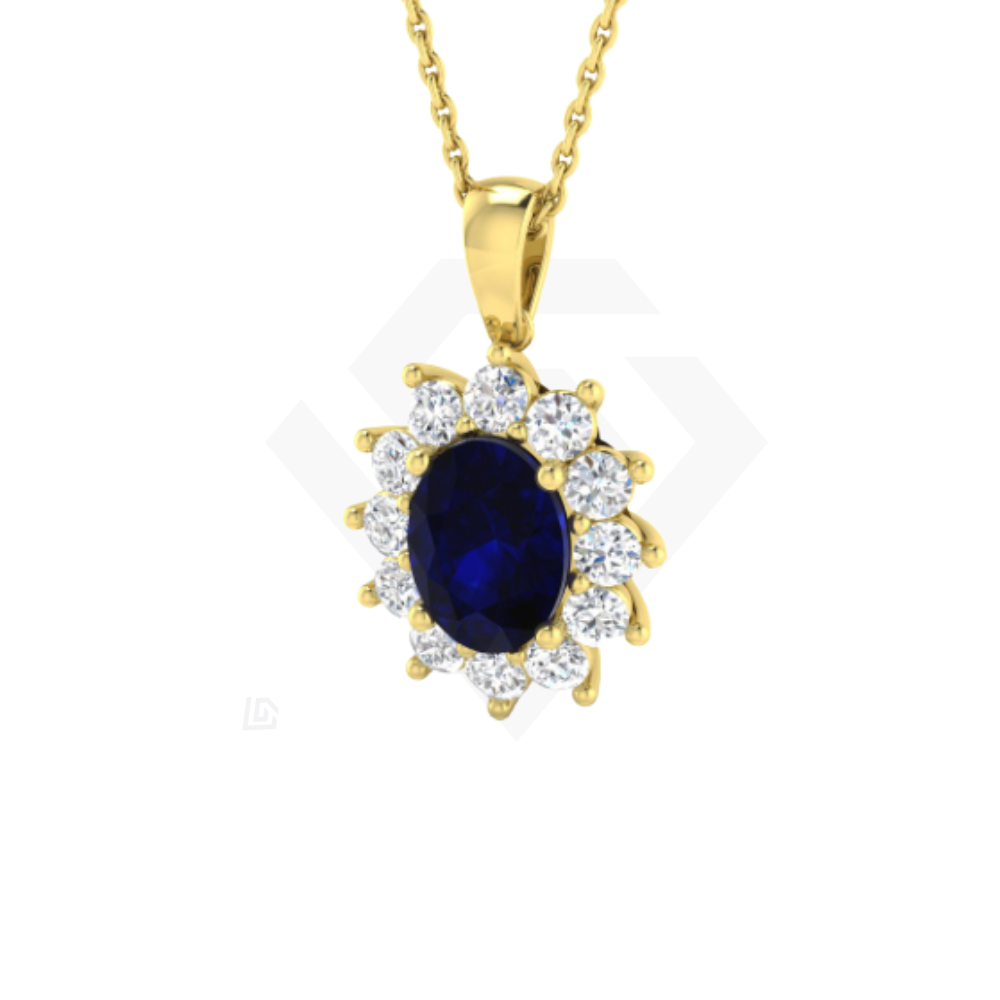 Add a touch of sophistication and timeless beauty with this exquisite 9k Yellow Gold Pendant, featuring a captivating 1.71ct Oval Lab-Created Blue Sapphire of premium AA quality. The deep, rich blue of the sapphire is perfectly complemented by a dazzling halo of 12 Round Brilliant CVD Lab Diamonds totalling 0.57ct, graded F Colour and VS Clarity for exceptional sparkle.