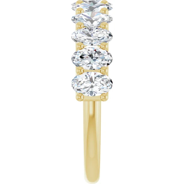 Celebrate your everlasting love with this exquisite 2 carat diamond half eternity ring. Meticulously crafted in gleaming Yellow Gold, this elegant piece showcases a row of dazzling Oval brilliant-cut diamonds, each perfectly matched for exceptional sparkle and brilliance. Expertly secured in a classic claw setting, the diamonds catch the light beautifully, creating a timeless and sophisticated look.