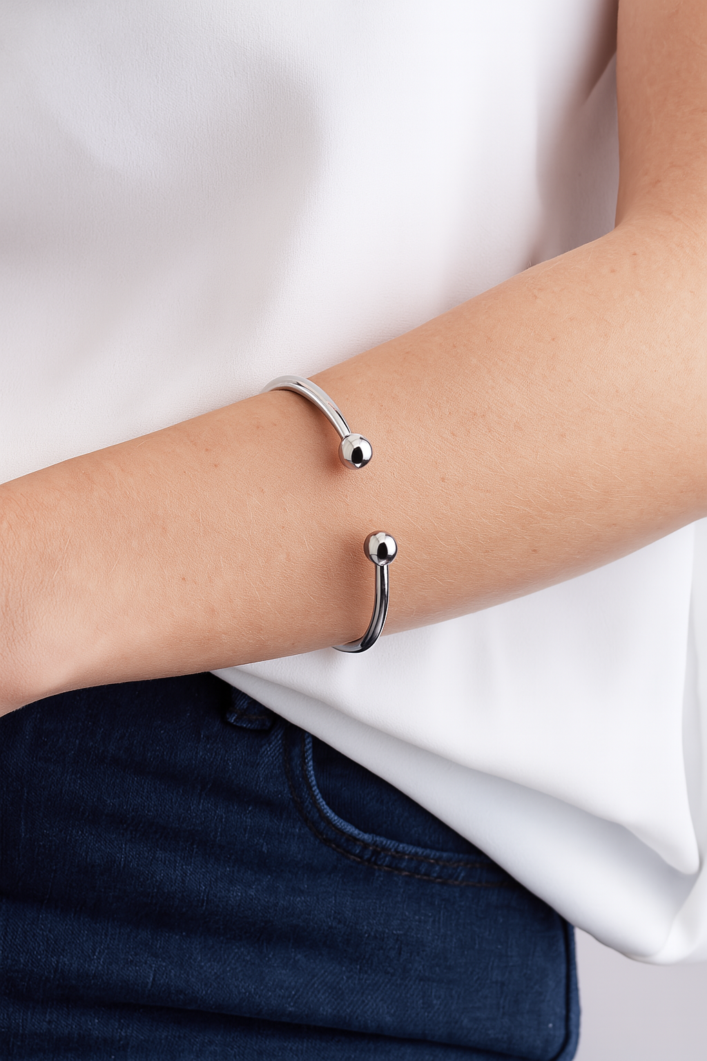 Sleek, stylish, and effortlessly elegant, this Sterling Silver Ladies Torque Bangle is a must-have piece for any modern jewellery collection. Crafted from high-quality 925 sterling silver, this open cuff bangle features a refined torque design finished with polished ball ends for a minimalist yet eye-catching look.