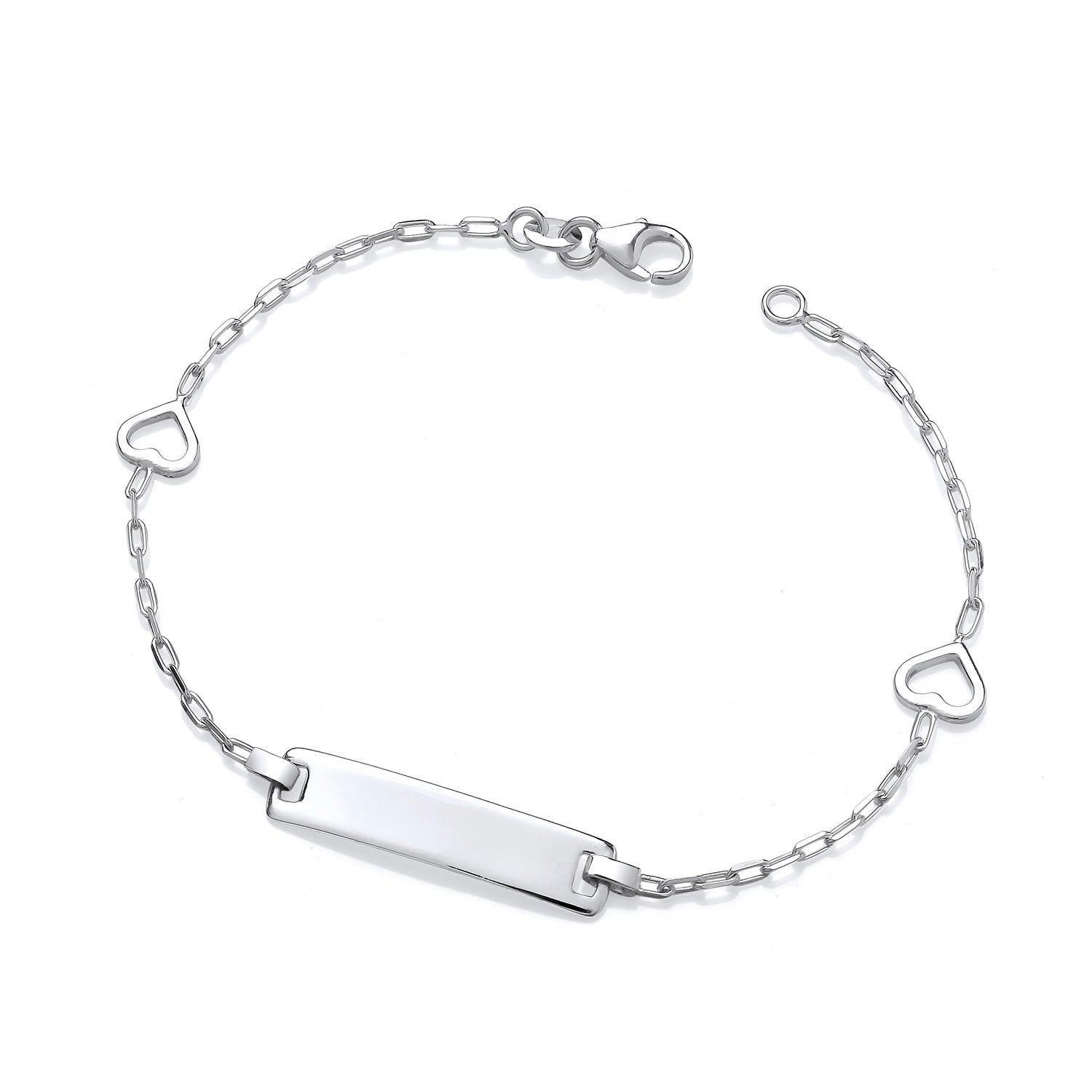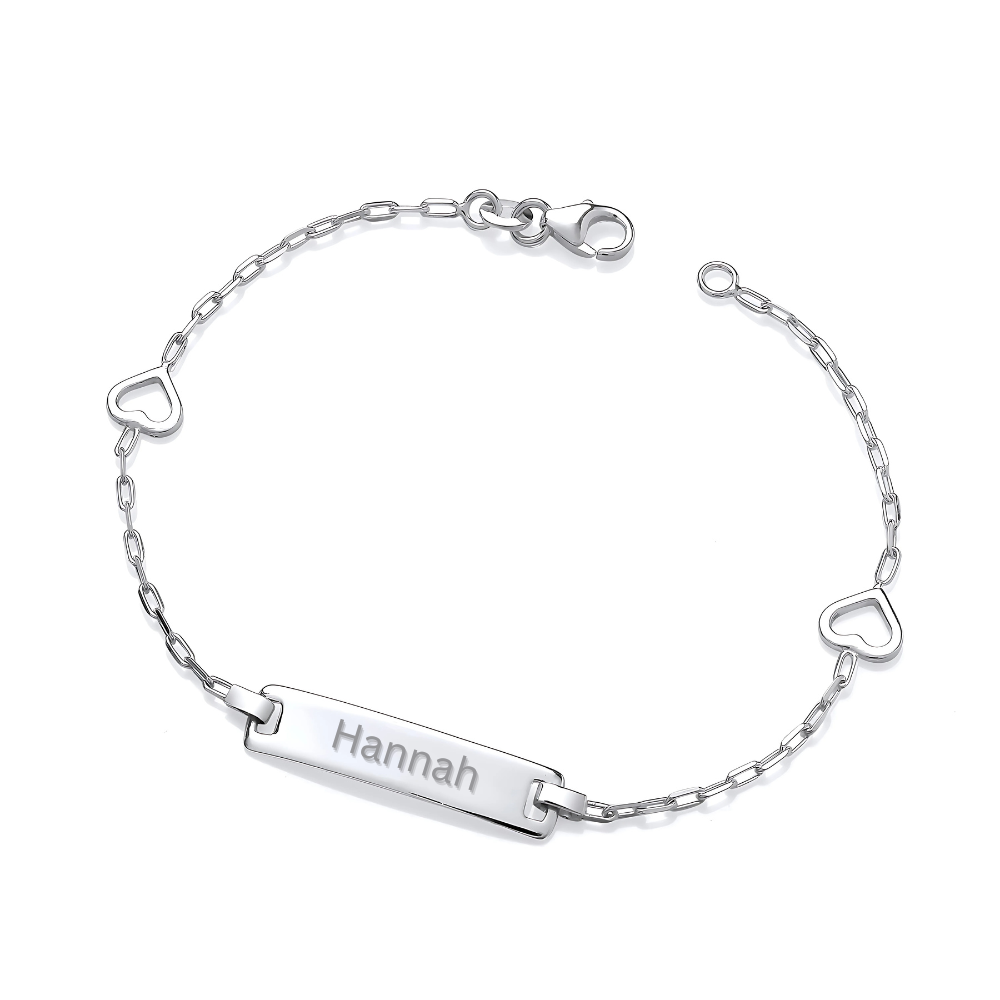 This elegant children’s ID bracelet is crafted in polished sterling silver, featuring a classic identity plate perfect for personal engraving. The delicate chain is accented with charming open-heart motifs, adding a touch of playful sophistication. Securely fastened with a durable lobster clasp, this bracelet combines timeless style with meaningful personalisation, making it an ideal gift for birthdays, christenings, or other special occasions. Its high-quality craftsmanship ensures long-lasting shine and wear, while the adjustable fit guarantees comfort for growing little wrists.