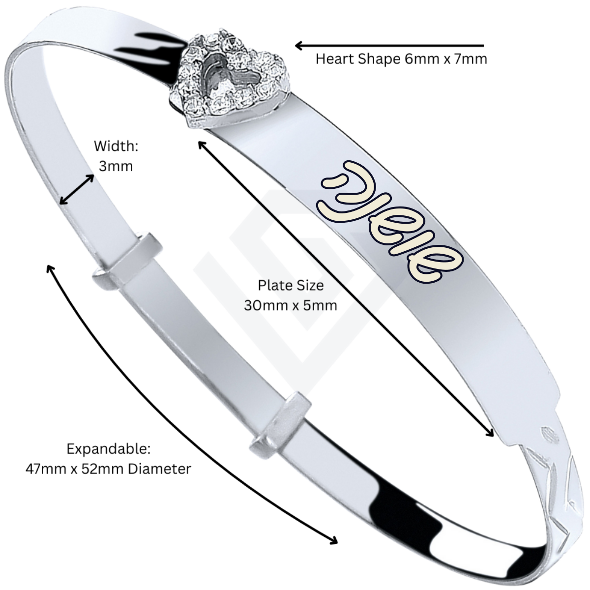 Sterling Silver 925 Personalised CZ Heart Baby ID Bangle-Hebrew Engraving