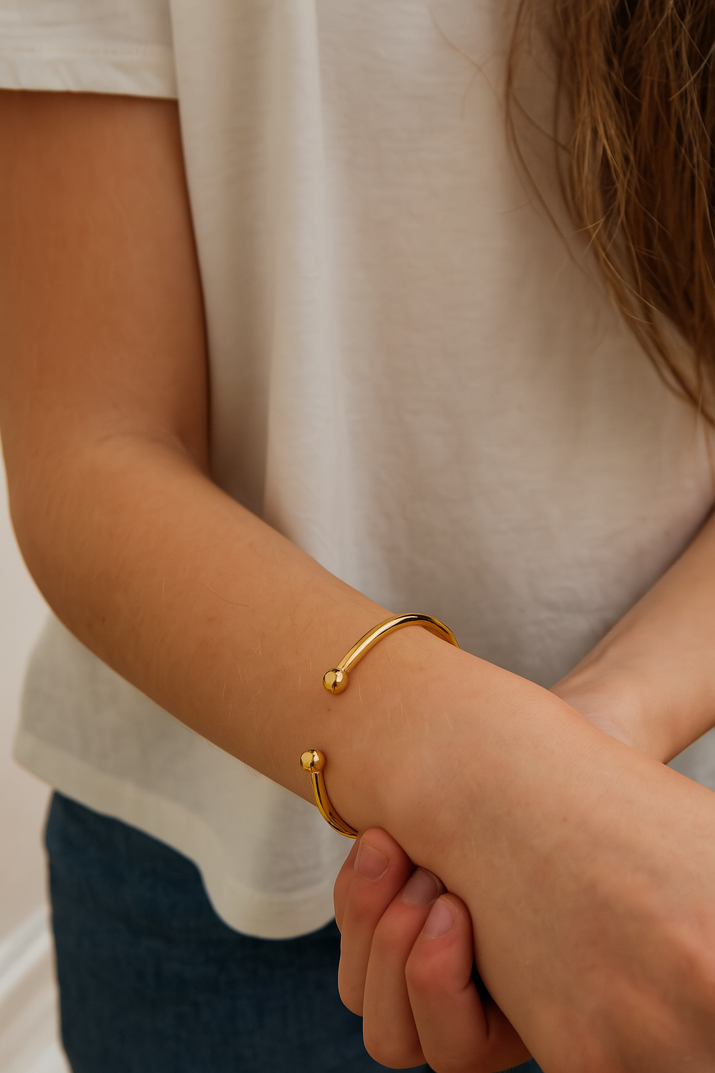 The rounded ball ends give this bangle a refined, classic touch – perfect for layering or wearing as a delicate standalone piece. Presented in a luxury gift box, it’s ready to become a treasured keepsake.