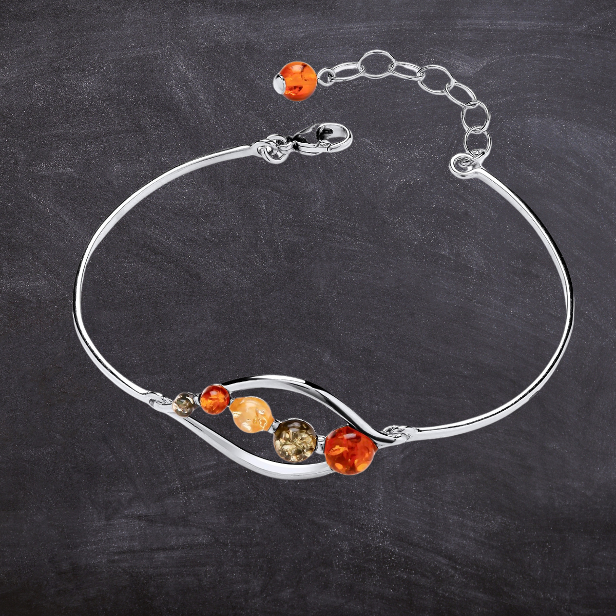 Crafted in polished sterling silver, this exquisite bangle showcases genuine Baltic amber in warm, natural tones. The contemporary open design is set with five round amber stones, capturing the beauty of nature in every detail. Elegant and versatile, it’s a timeless piece that adds a touch of sophistication to any look — perfect for both everyday wear and special occasions.