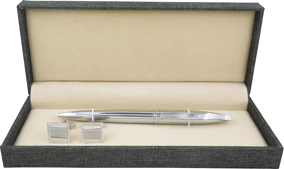 'Dorchester' Ballpoint pen & a pair of cufflinks with an engravable plain square design with patterned border.