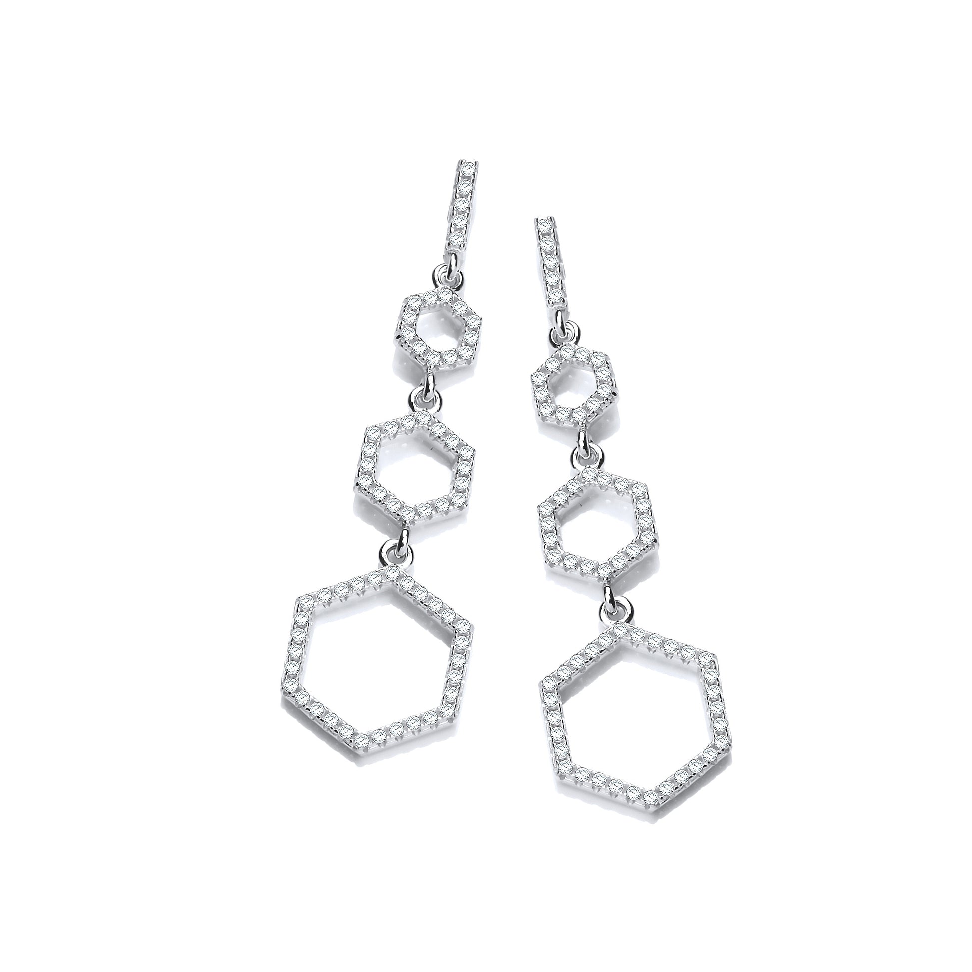 Stylish sterling silver drop earrings featuring a modern honeycomb-inspired design, adorned with sparkling cubic zirconia for a chic and elegant finish.