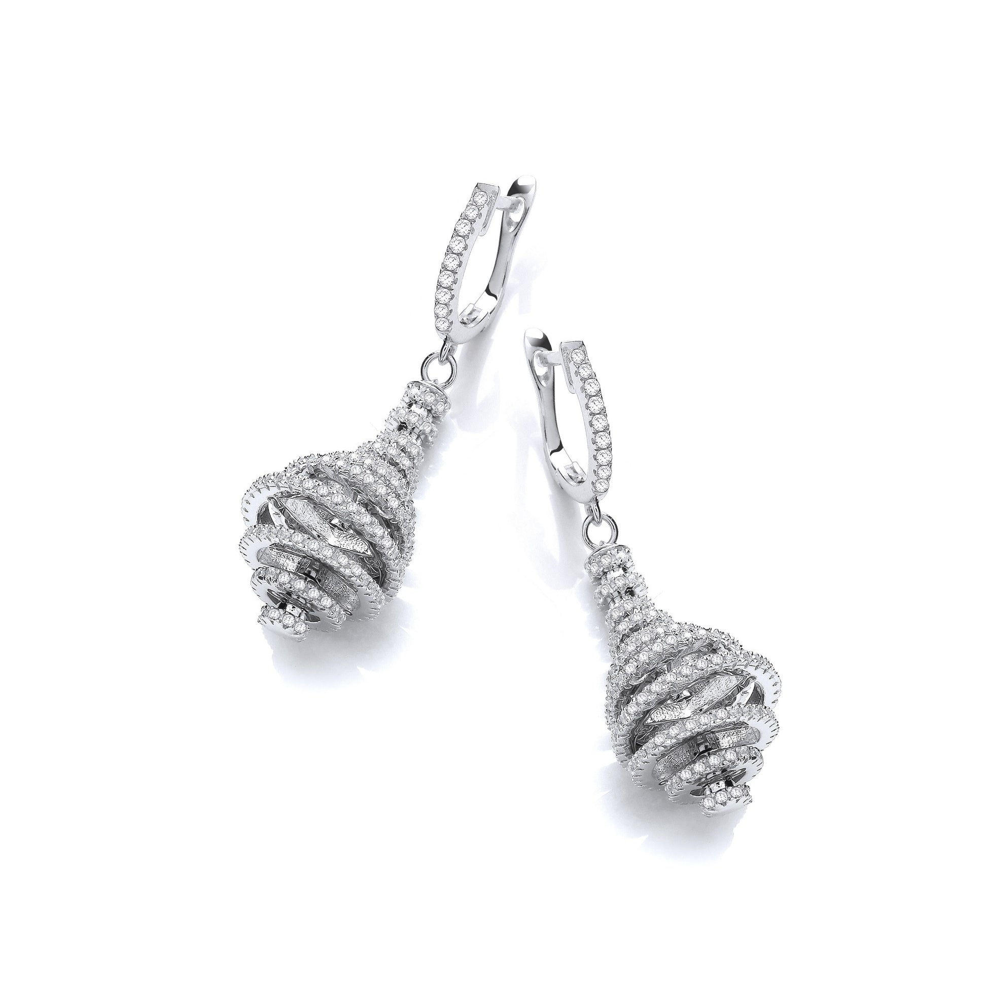 Unique pear-shaped drop earrings featuring layered circular designs, intricately set with micro pavé cubic zirconia for a glamorous and modern statement look.