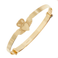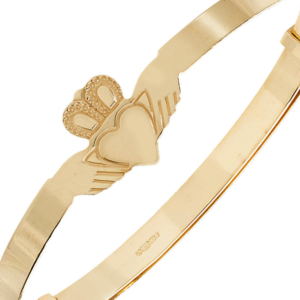 A beautiful 9ct yellow gold expanding baby bangle featuring the traditional Claddagh design with heart, hands, and crown. Weighing 2.00g, this meaningful piece symbolises love, friendship, and loyalty, making it a perfect keepsake for christenings, birthdays, or special celebrations.
