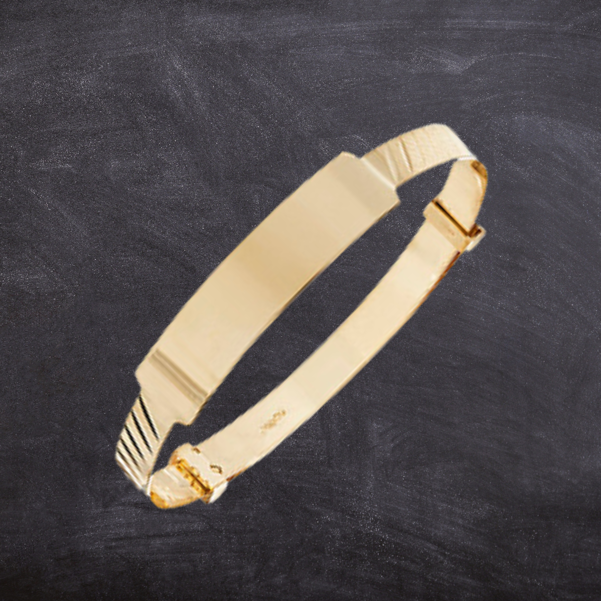 A classic 9ct yellow gold expanding baby identity bangle with subtle engraved detailing at the edges. Weighing 2.80g, this engravable piece is ideal for adding a personal touch, making it a meaningful gift for christenings, birthdays, or other special milestones.
