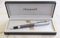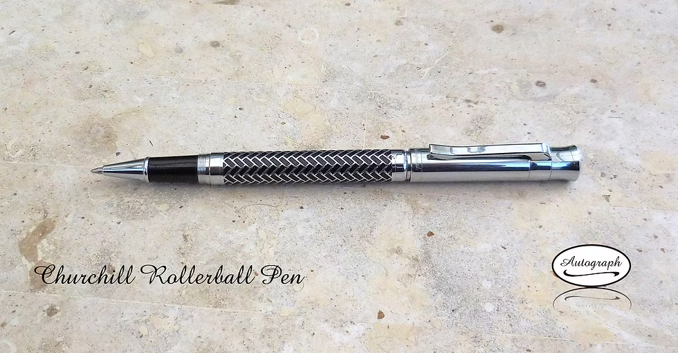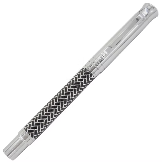 Chrome-plated rollerball pen. Barrel has a block paved drive brick-pattern.