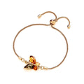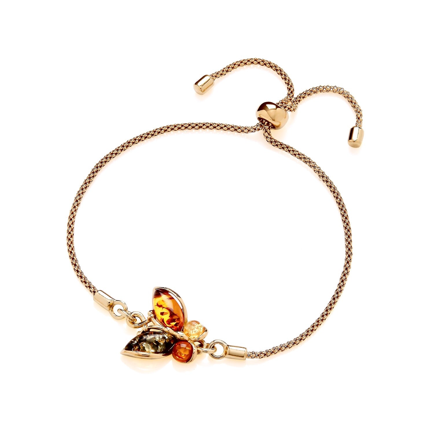 A beautiful gold-plated sterling silver bracelet showcasing a graceful butterfly design adorned with genuine multi-coloured natural baltic amber. Each amber wing—honey, cognac, and green—captures the light with warmth and radiance, symbolising transformation and elegance. The adjustable pull-style clasp ensures a perfect, comfortable fit for any wrist.