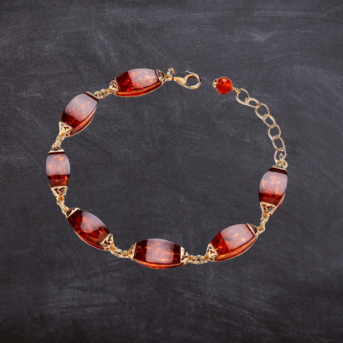 This luxurious bracelet combines the golden glow of polished amber with the elegance of gold-plated sterling silver. Each marquise-shaped natural Baltic amber gemstone is set within an intricately designed frame, creating a timeless and sophisticated piece. A perfect blend of natural beauty and refined craftsmanship.
