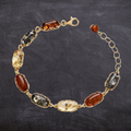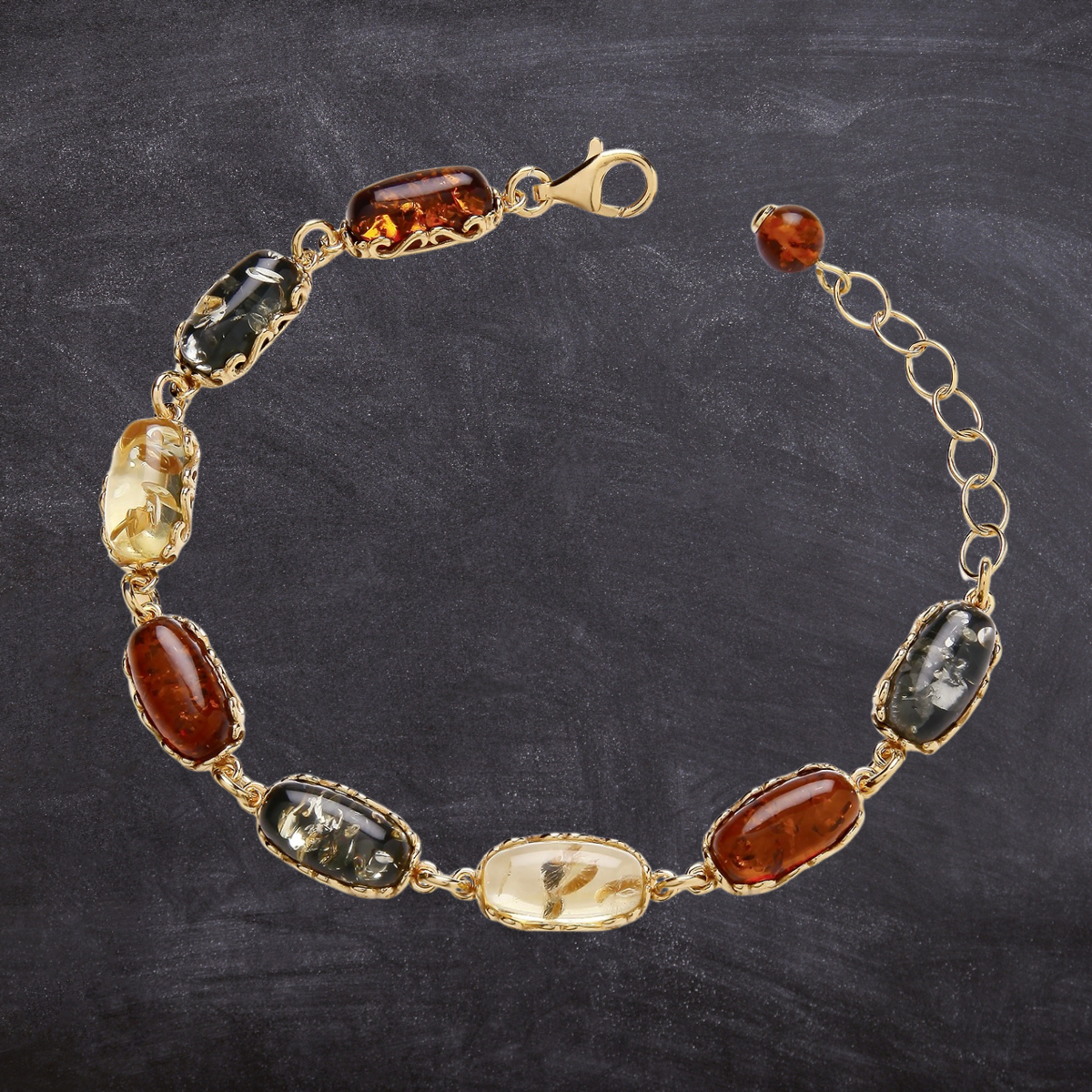 This exquisite bracelet combines the warmth of gold-plated sterling silver with the natural beauty of Baltic amber in mixed tones. Each oblong amber gemstone — in shades of honey, cognac, and green — is beautifully framed in gold, creating a radiant piece that’s both classic and contemporary. Perfect for elevating any outfit with a touch of natural luxury.