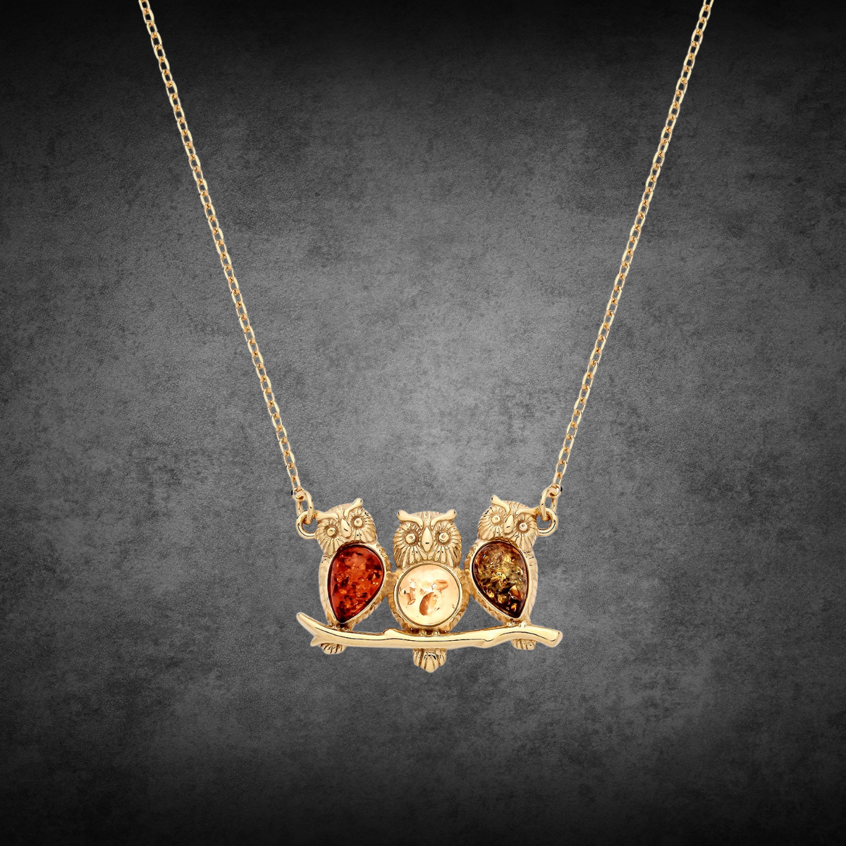 Embrace charm, warmth, and meaningful symbolism with this stunning Gold On Sterling Silver Natural Baltic Amber Owl Necklace. Featuring three beautifully detailed owls perched on a delicate branch, this piece captures the essence of wisdom, protection, and family.