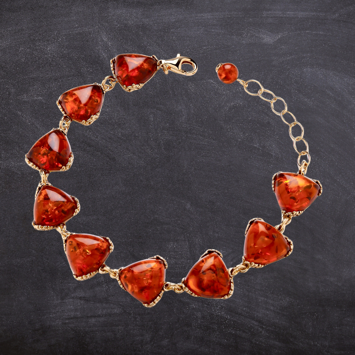 Crafted in gold-plated sterling silver, this striking bracelet features beautifully polished triangular natural Baltic amber gemstones. The warm golden tones enhance the rich amber hues, creating a luxurious and timeless design that exudes sophistication and style.