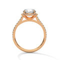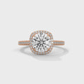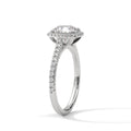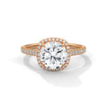 A classic round halo setting with a refined diamond-accented band, designed to showcase the centre stone with timeless elegance.