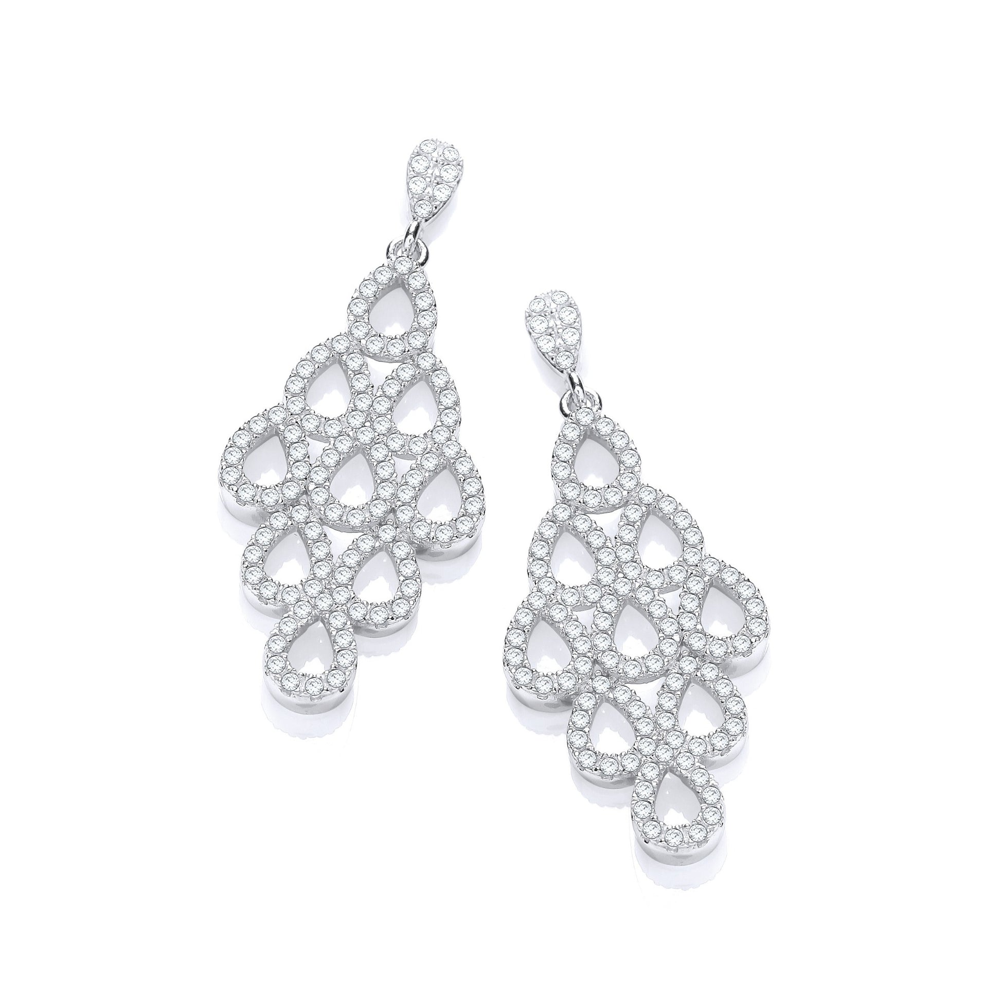 Sophisticated sterling silver drop earrings featuring an intricate openwork design with cascading teardrops, beautifully set with micro pavé white cubic zirconia for a dazzling, statement-making finish.