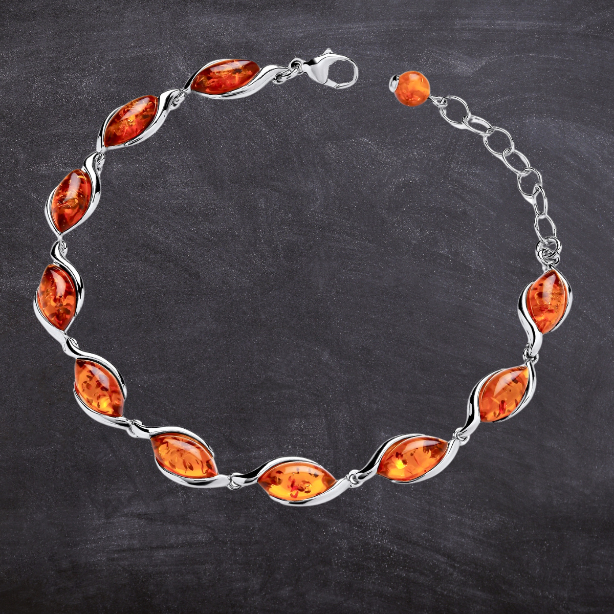 Elegant and refined, this sterling silver bracelet features a sequence of natural Baltic amber stones shaped into graceful marquise designs. The warm amber tones radiate through the polished silver setting, creating a timeless piece that adds sophistication and natural beauty to any outfit.