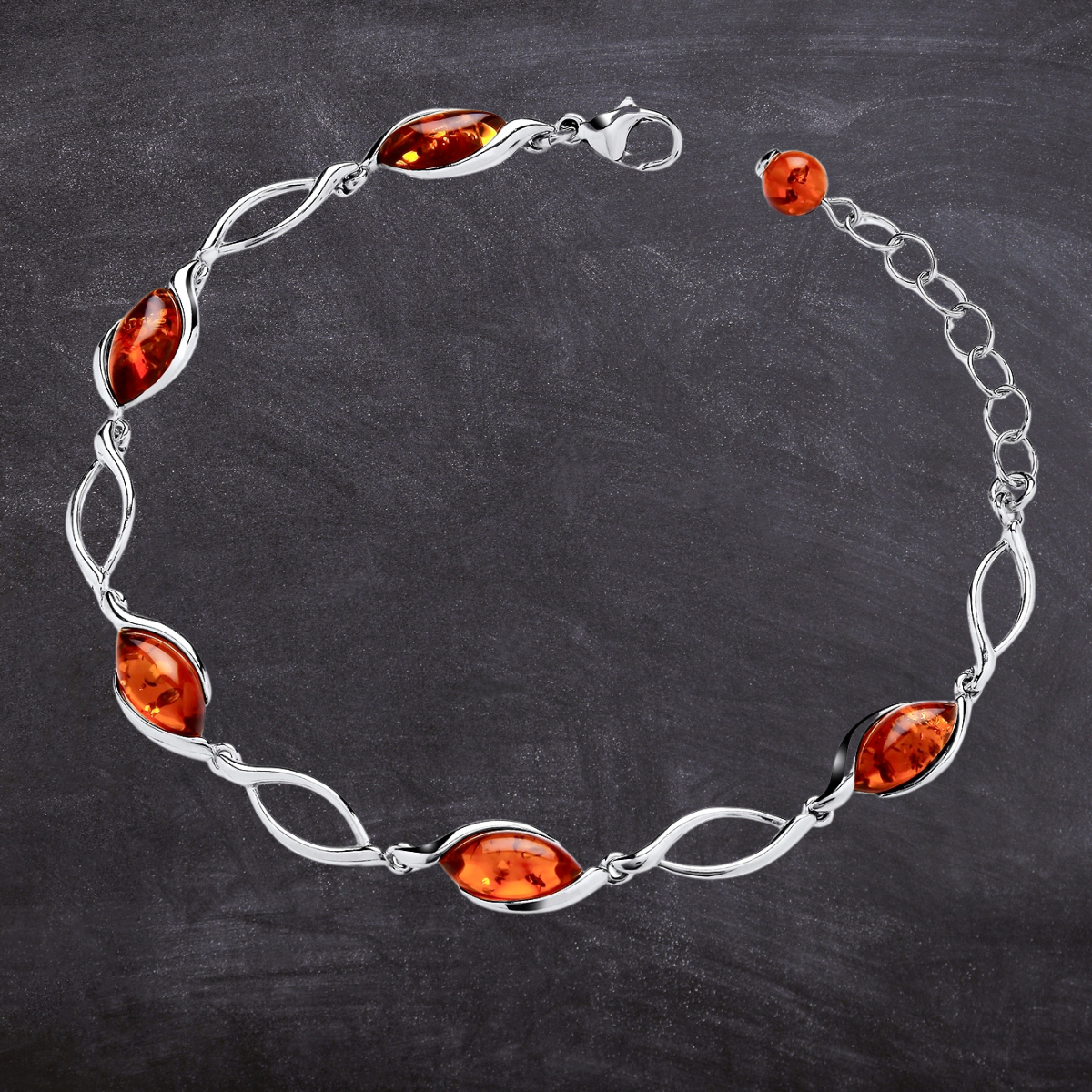 Crafted in sterling silver, this elegant bracelet features natural Baltic amber stones in sleek marquise settings. The open link design adds a modern touch, allowing the warm amber tones to glow beautifully against the polished silver finish — a timeless accessory for any occasion.