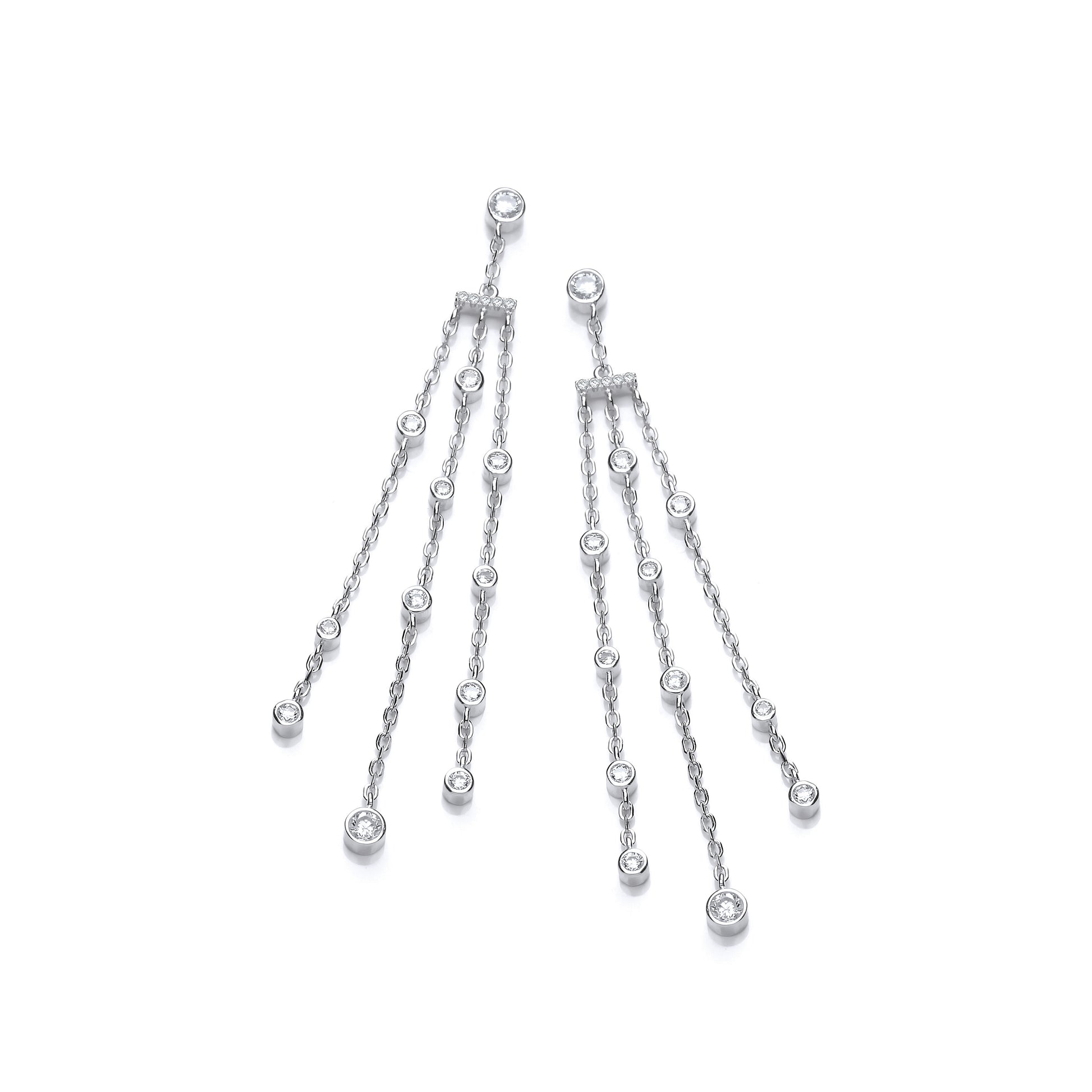 Elegant sterling silver drop earrings featuring three delicate chains adorned with bezel-set cubic zirconia for a modern, graceful sparkle.